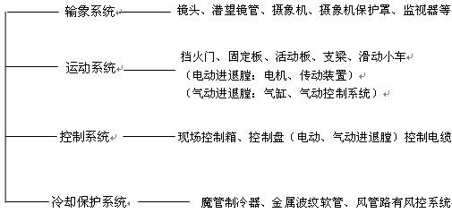 電動(dòng)及氣動(dòng)進(jìn)退膛電視監(jiān)視裝置,在冷卻風(fēng)出現(xiàn)斷風(fēng)故障時(shí),能自動(dòng)將潛望鏡管退出爐膛,以免燒壞輸象系統(tǒng),操作人員也可在控制室內(nèi)通過(guò)控制盤上的操作按鈕或電腦控制潛望鏡管的進(jìn)退爐膛。